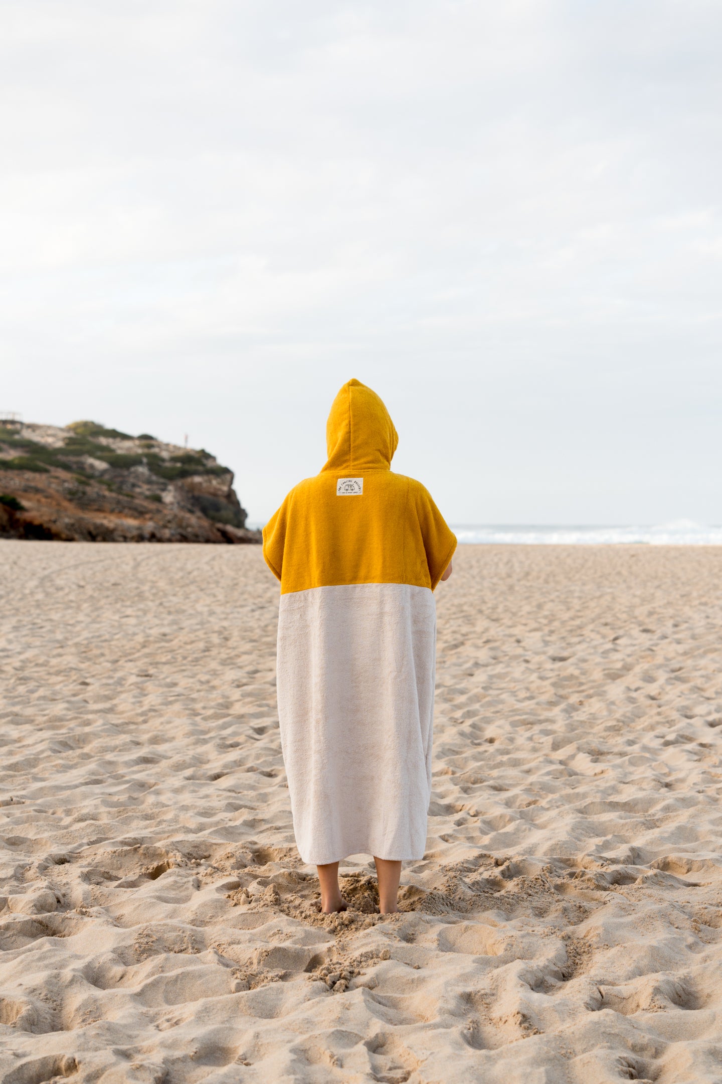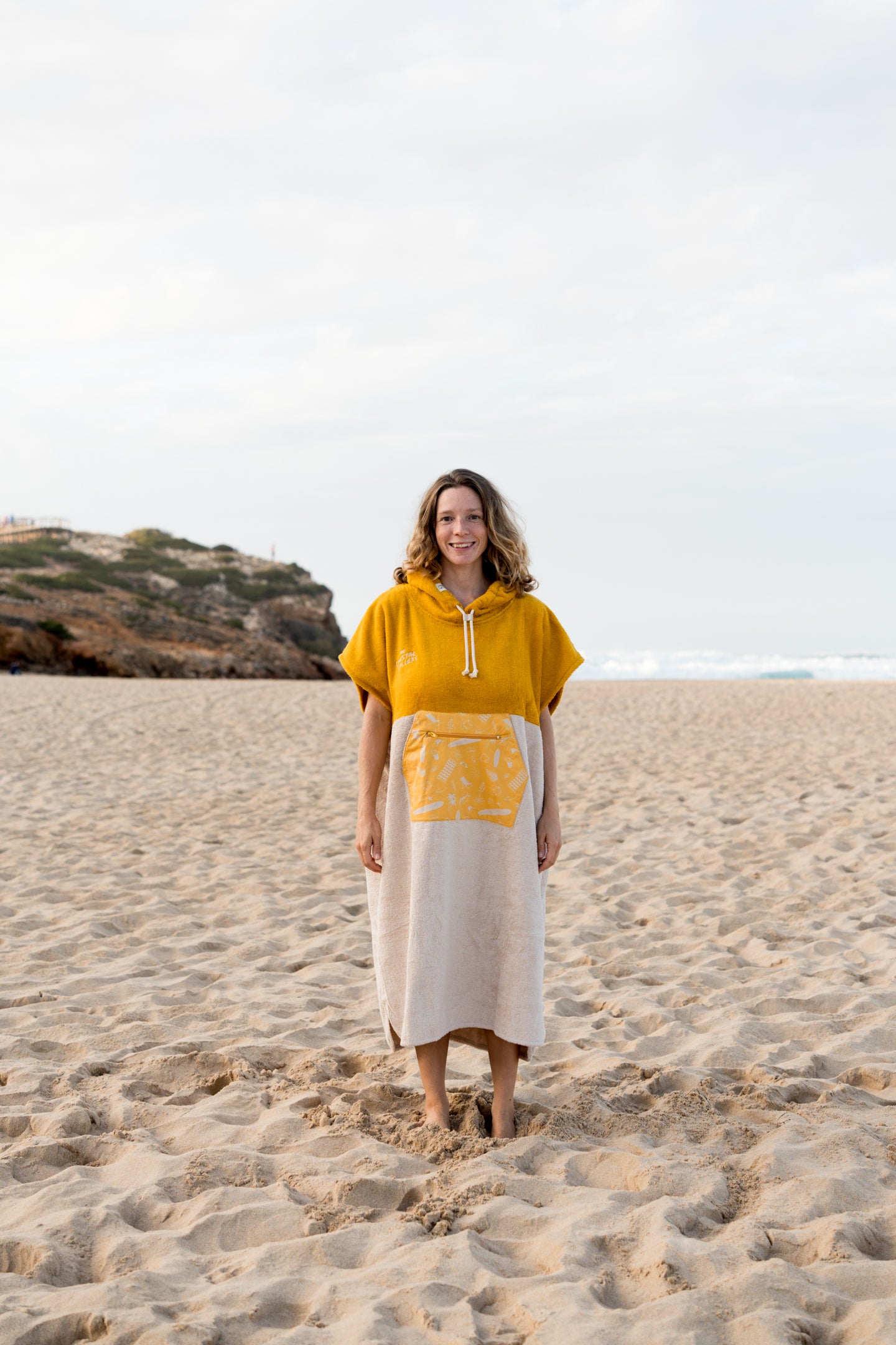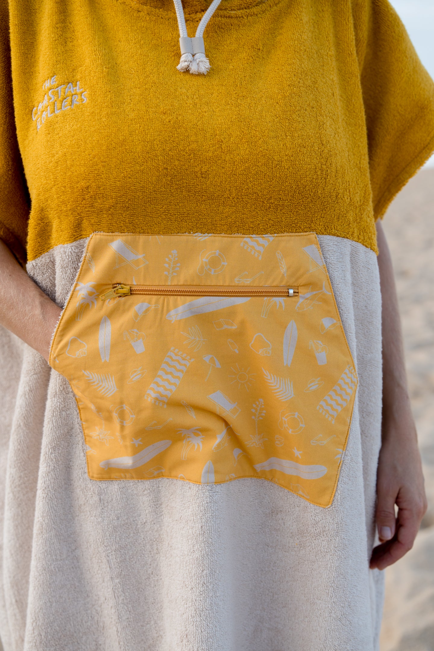 Der Sun Chaser Poncho bringt das Feeling eines endlosen Strandtages direkt zu dir. In leuchtendem Senfgelb und mit Sommer- und Strandmotiven, ist er dein stylischer Begleiter – egal ob nach dem Surf oder einfach zum Relaxen.