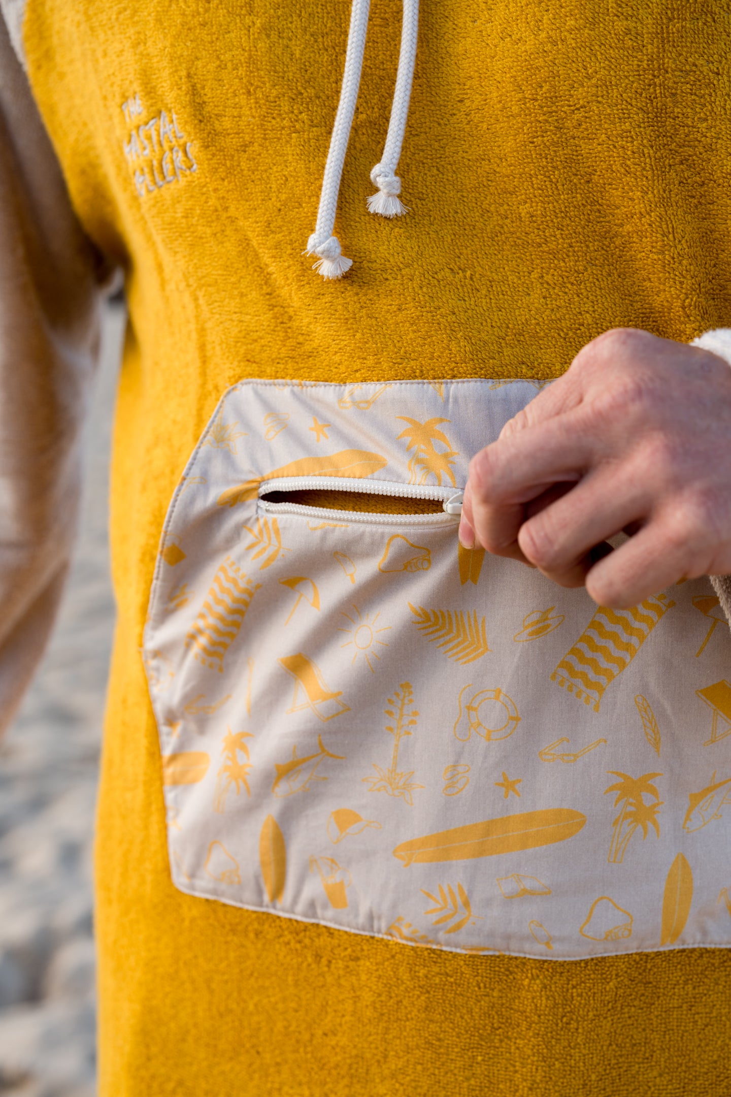 Der Sun Chaser Poncho bringt das Feeling eines endlosen Strandtages direkt zu dir. In leuchtendem Senfgelb und mit Sommer- und Strandmotiven, ist er dein stylischer Begleiter – egal ob nach dem Surf oder einfach zum Relaxen.